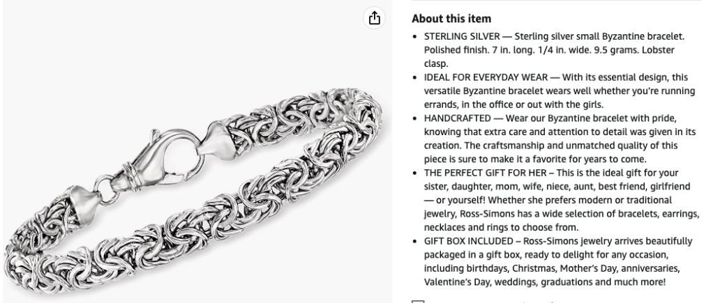 I wrote consumer friendly copy for Ross-Simons Amazon descriptions. The company previously used a third-party company that produced lackluster copy. I created the bullet format and edited copy for each jewelry item. During my time at the company, I updated thousands of descriptions, especially the company’s best-selling items that got the most views.